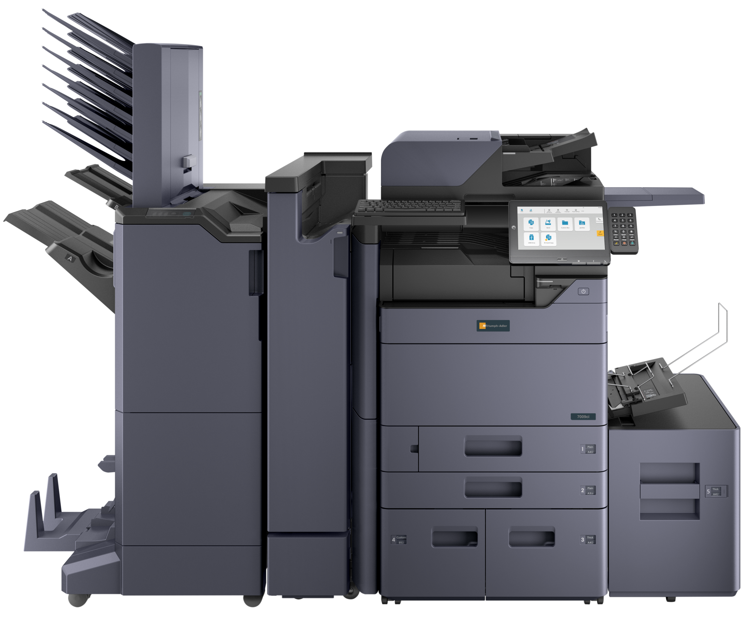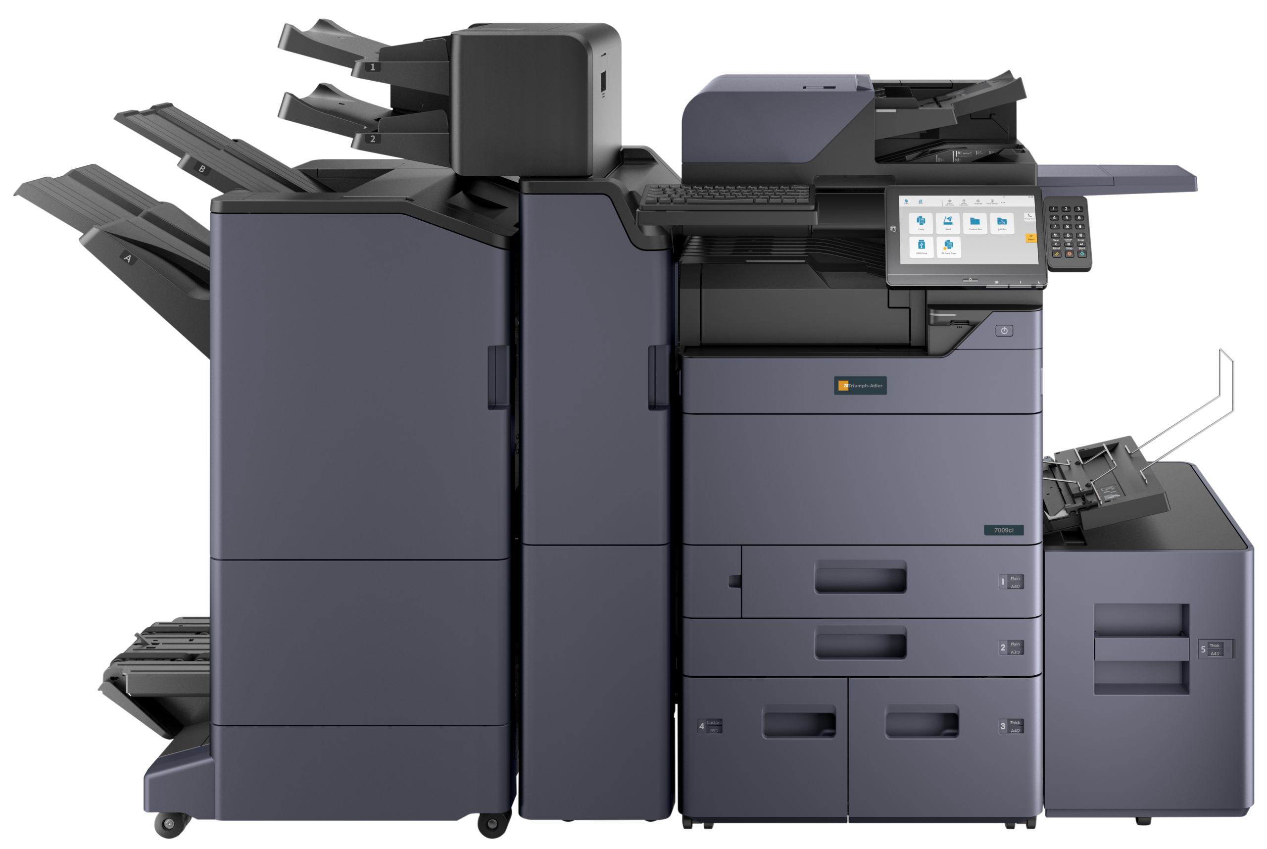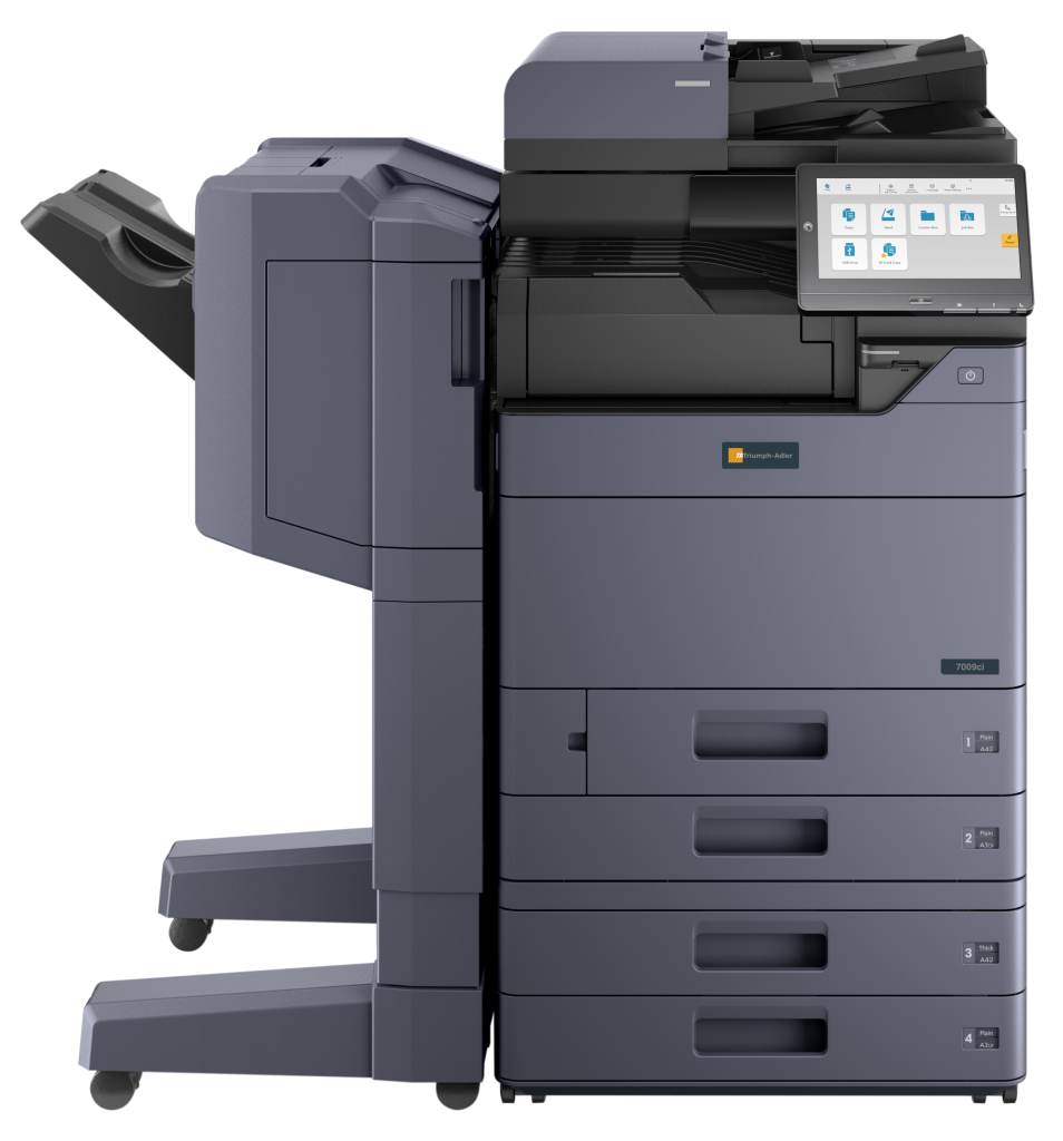 Le système multifonctions A3 est votre partenaire idéale pour un travail de bureau intelligent, efficace et tourné vers l’avenir. Découvrez comment une intégration transparente aux applications cloud, une qualité d’impression exceptionnelle et une utilisation intuitive peuvent améliorer vos flux de travail. La gamme de produits 7009ci offre des vitesses d’impression et de copie de 40, 50, 60 à 70 pages A4 par minute, en couleur ou en noir et blanc. Grâce à sa flexibilité, sa vitesses d’impression élevée et sa capacité à gérer efficacement les gros travaux d’impression, ce système augmente la productivité dans tous les environnements de travail.